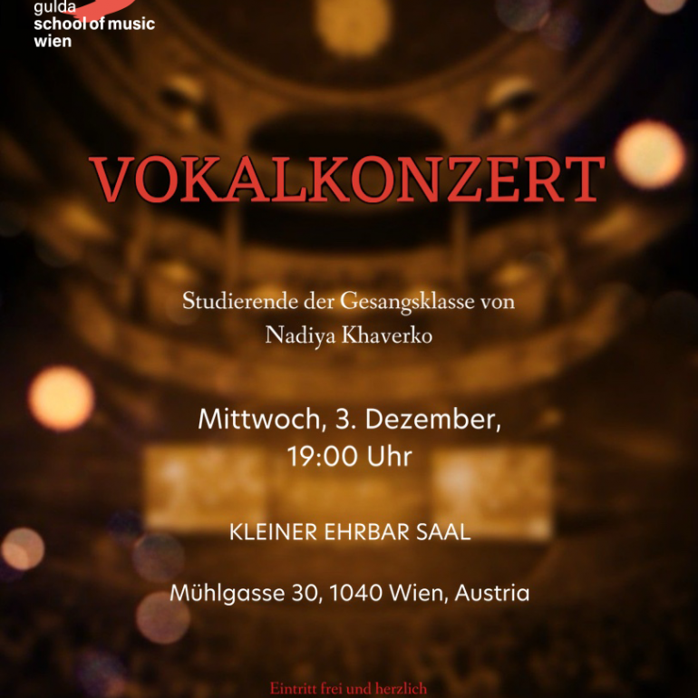 Am Mittwoch, den 03. Dezember um 19:00 Uhr laden die Studierenden der Gesangsklasse von Nadiya Khaverko zu einem besonderen Vokalkonzert ein. Freuen Sie sich auf ein abwechslungsreiches Programm, das die Vielfalt und Ausdruckskraft der menschlichen Stimme in den Mittelpunkt stellt.